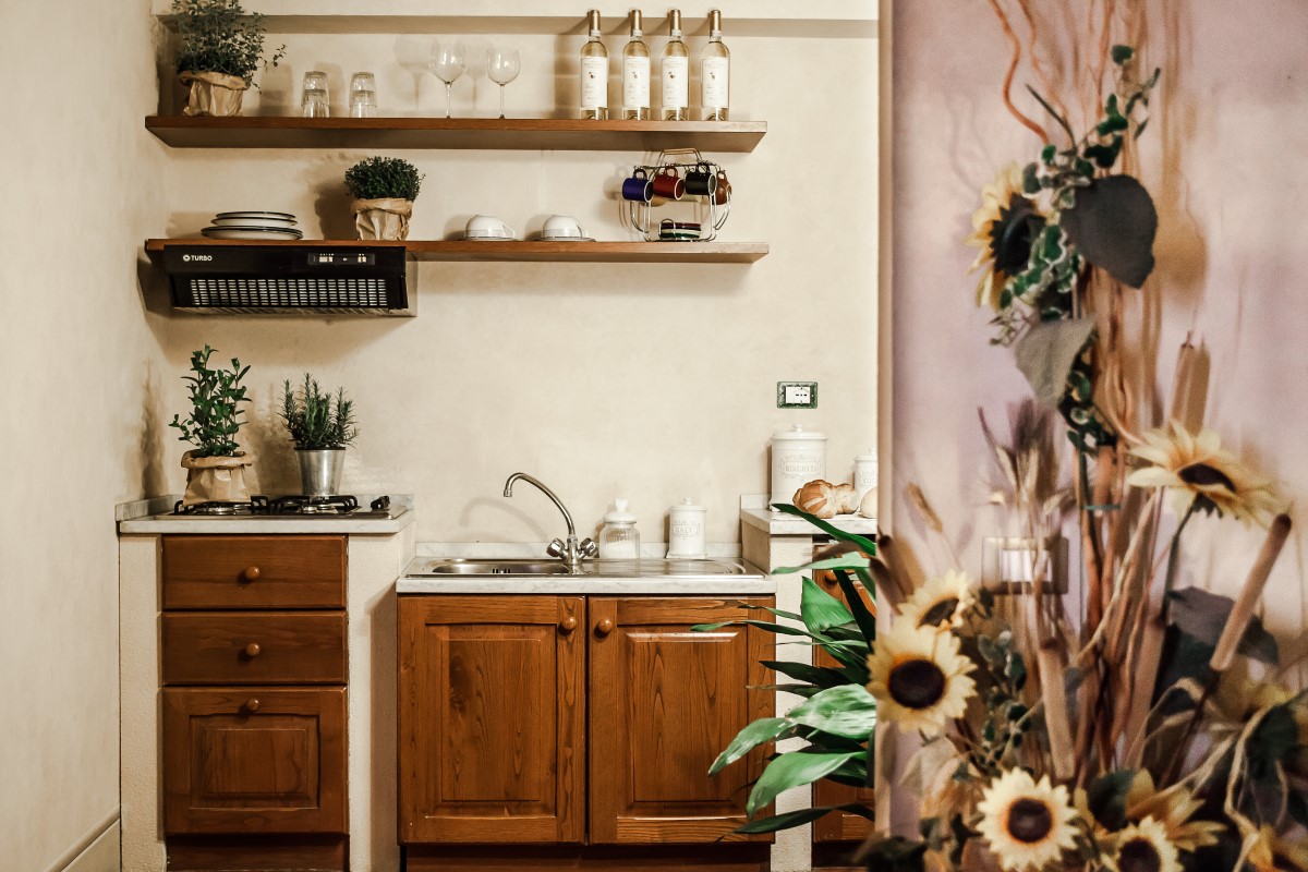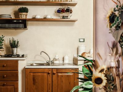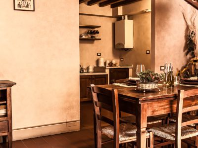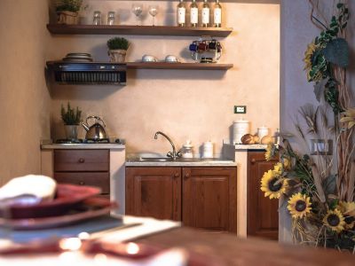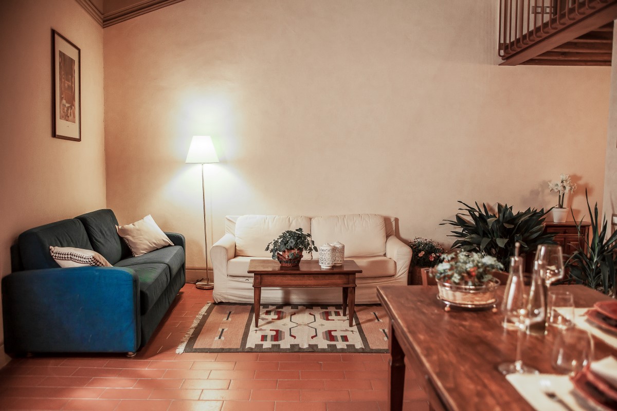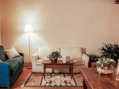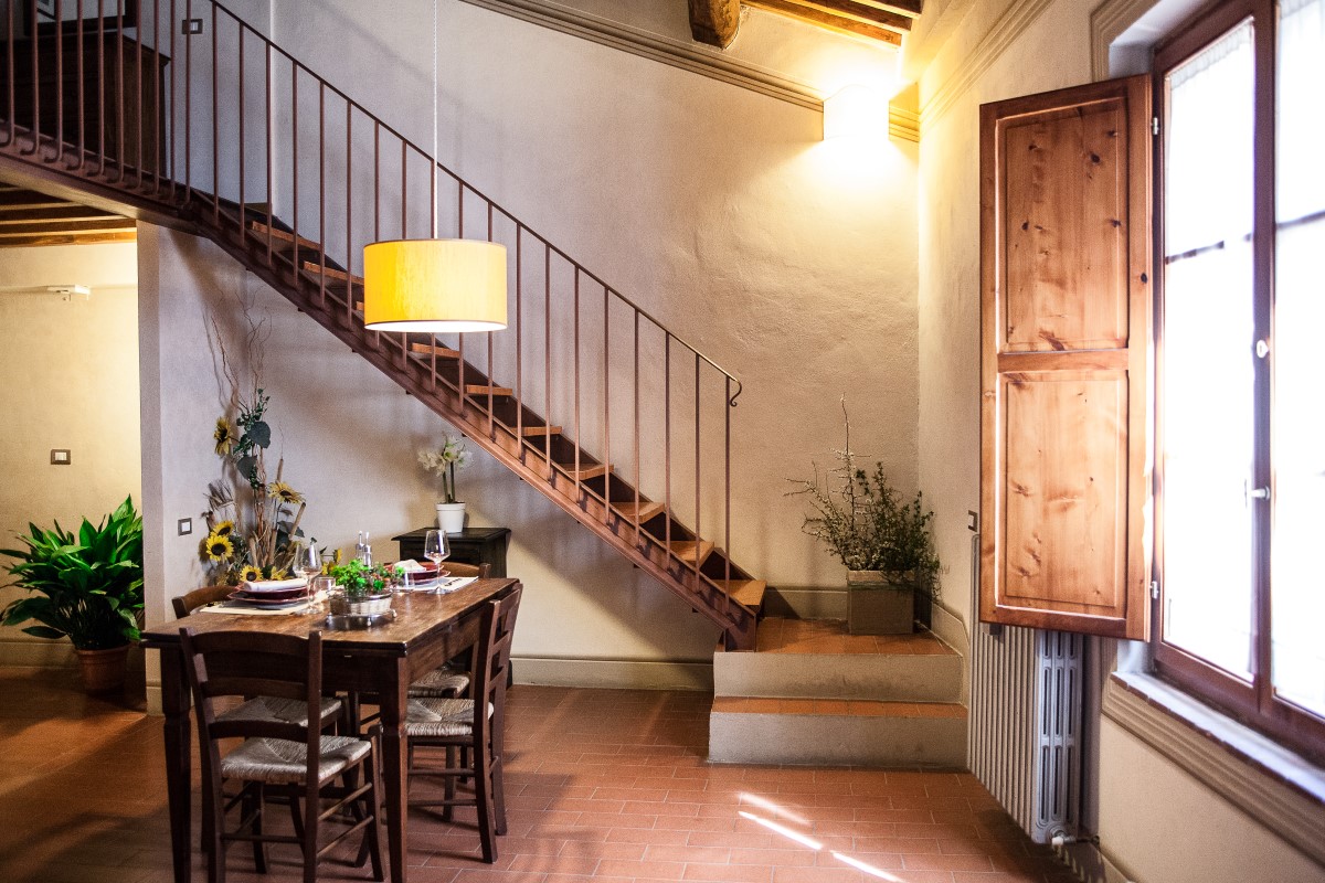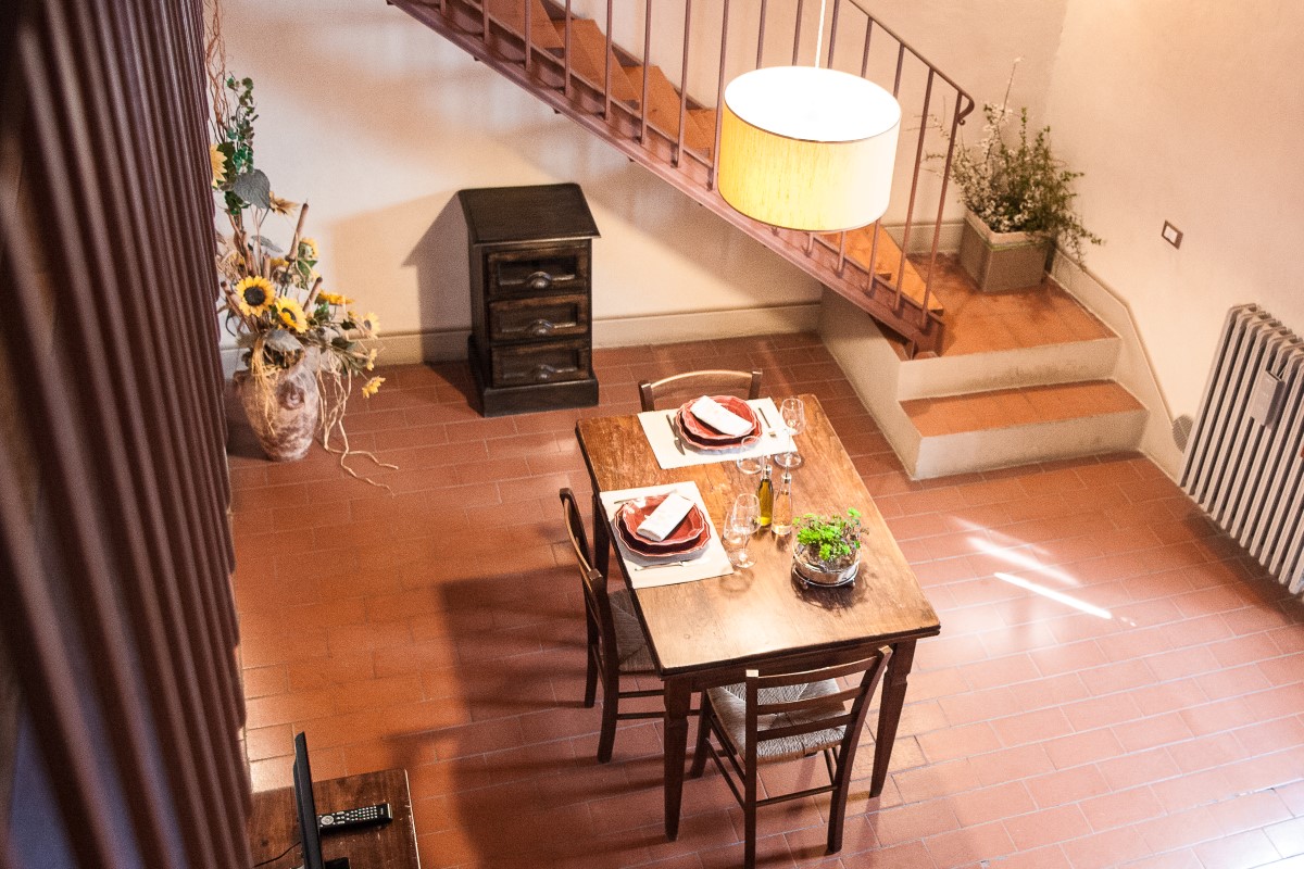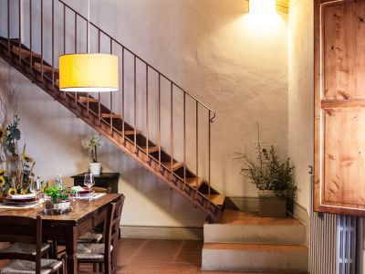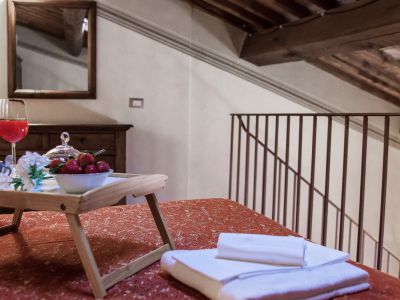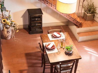 This holiday apartment was formerly a farmhouse barn, whose high ceiling has not been altered in the years. The name of the apartment is a tribute to the figure of the “farmer” who played an important role within the farm organisation. It is a large studio of 70 sqm. on two levels; in the mezzanine there is the bedroom and on the ground floor the living room, the kitchen and the bathroom with bathtub. The apartment has a large window overlooking the alley Via Cellolese (pedestrian area) and a small clerestory upstairs, from which you can admire the starry nights of San Gimignano. Romantic.