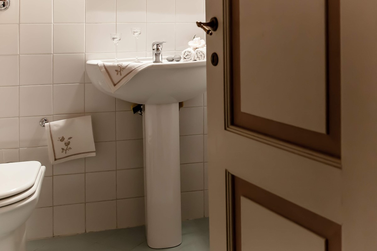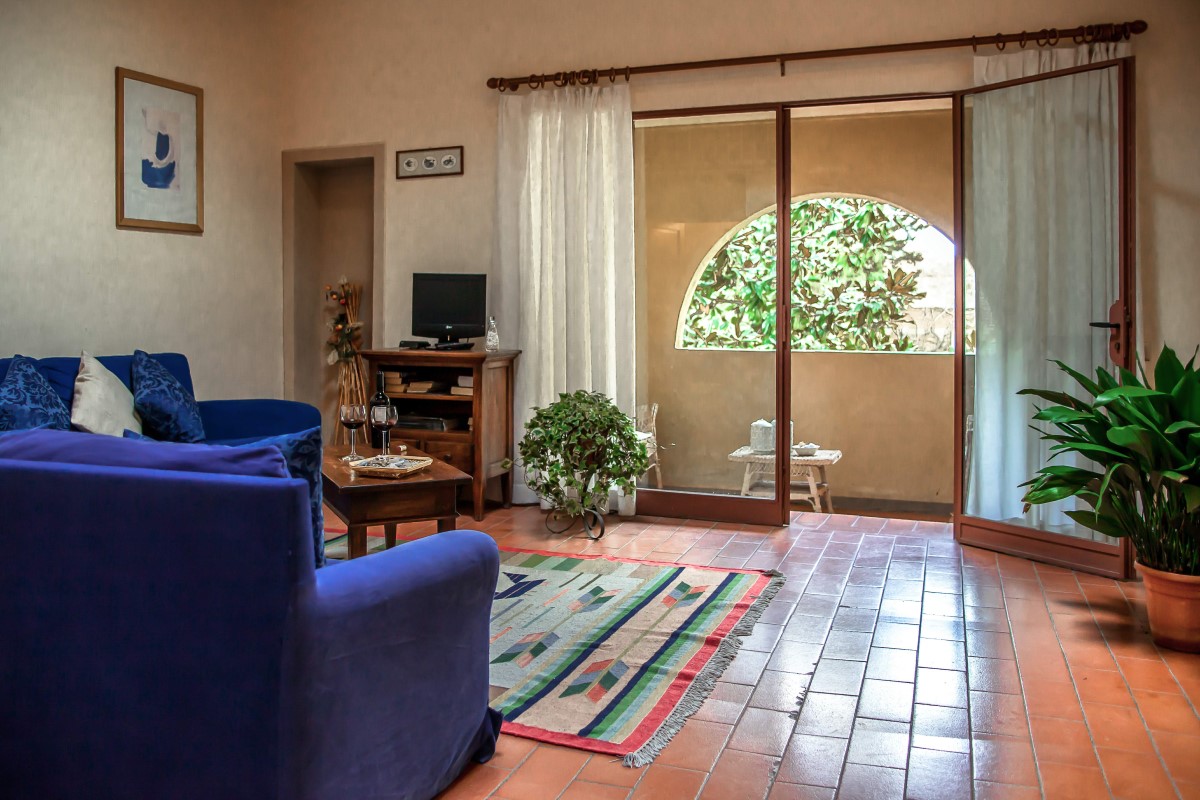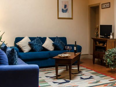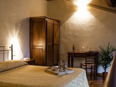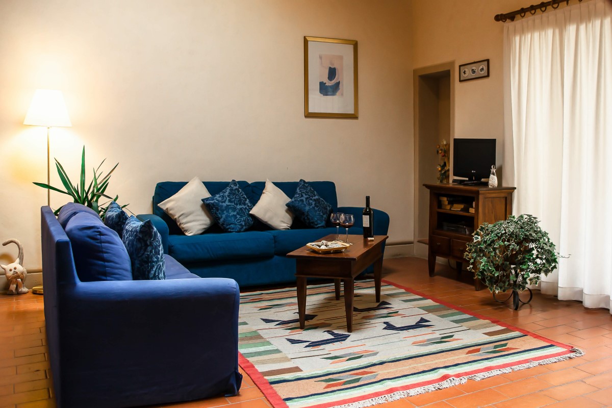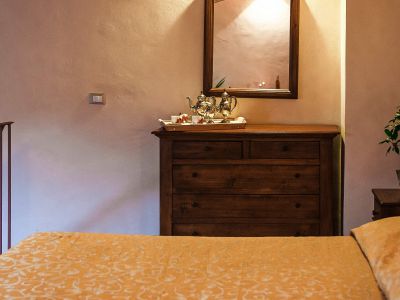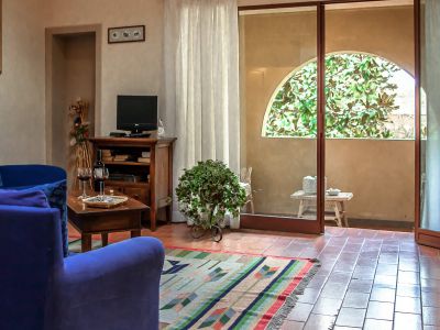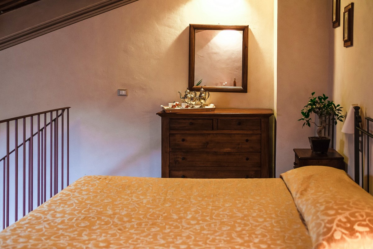 This holiday apartment was originally a farmhouse barn, used for grains storage. The characteristic barn structure is still visible from the typical high ceiling with a large skylight, that makes this apartment very bright. It is a large two-levels studio of 70 sqm: the mezzanine hosts the bedroom and the ground floor the living room, the kitchen and a bathroom with bathtub. A small balcony overlooks the garden; very quiet. Suggested for a romantic stay.
